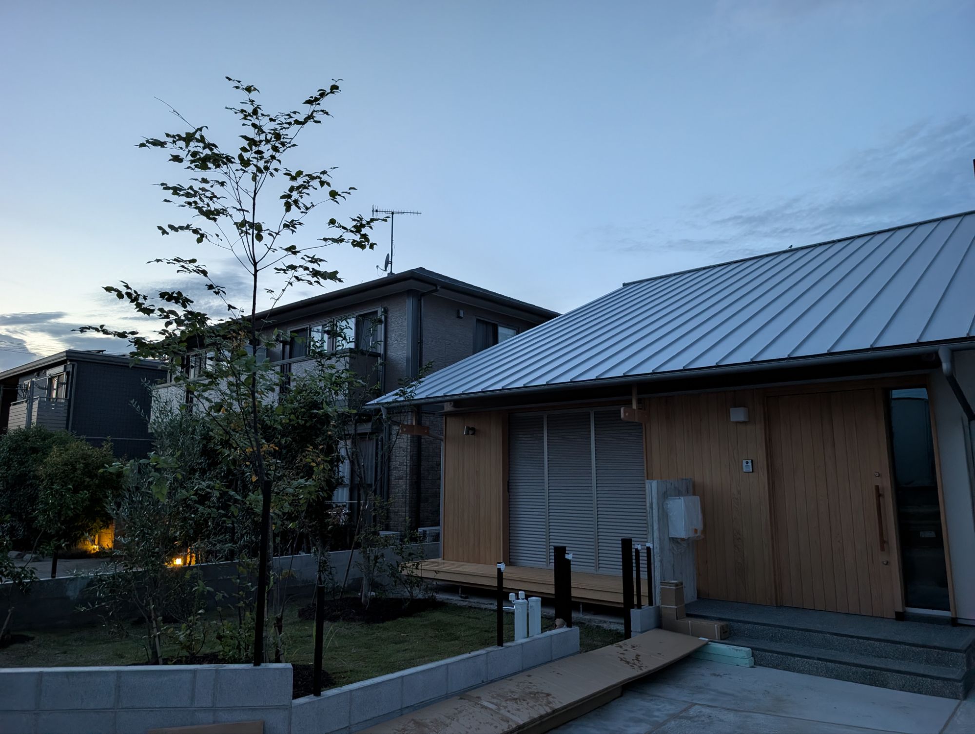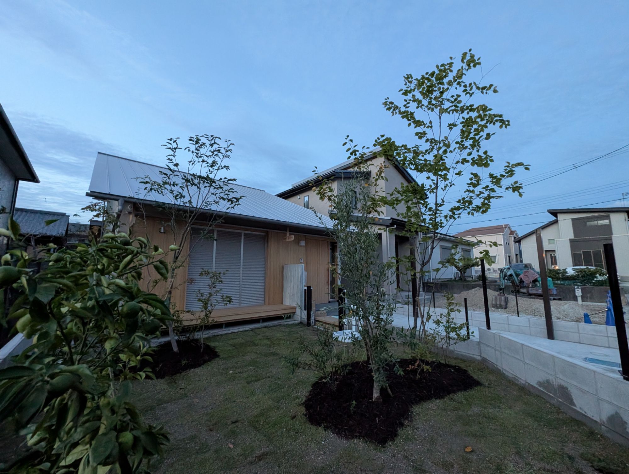 播磨郡稲美町の家: 建築設計 井藤工務店 2025年9月施工 植栽と芝。靴脱延石施工 2025年9月完成見学会開催中 https://www.i10house.com/news/Ltjhd025 井藤工務店 https://www.i10house.com/